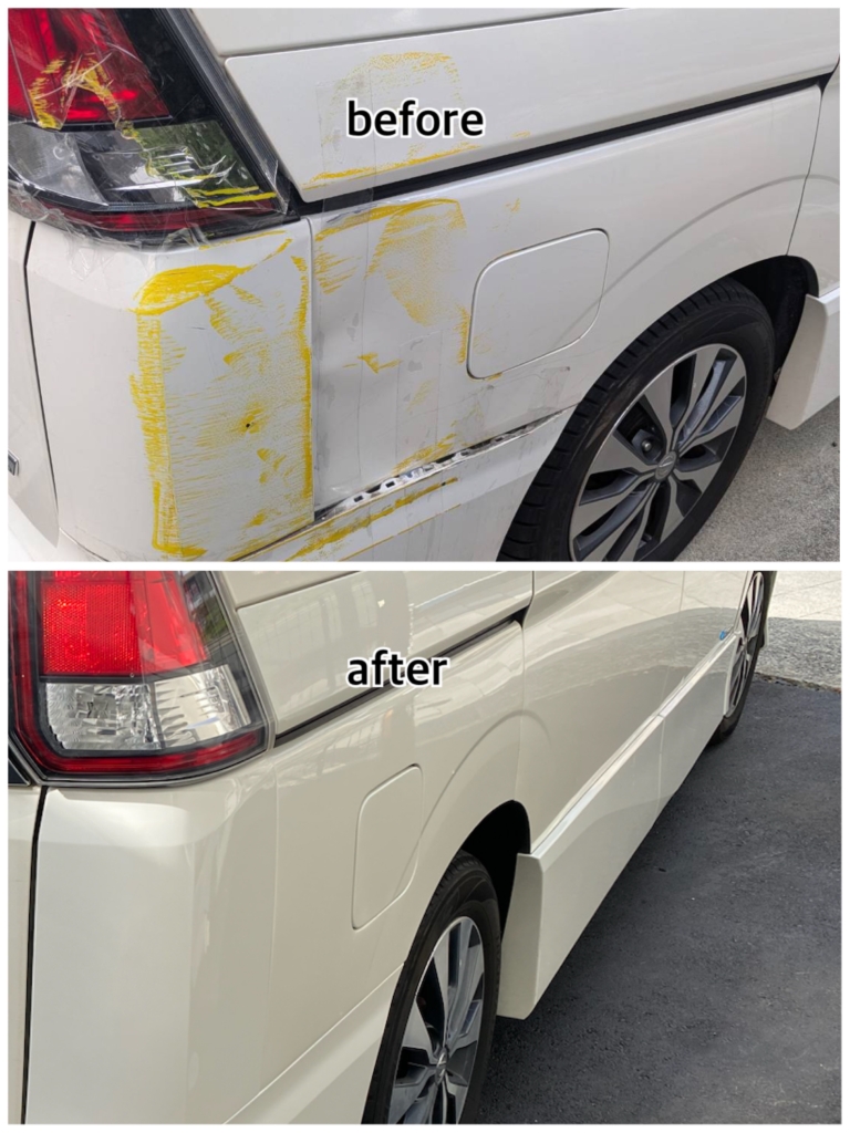 神戸市東灘区よりご来店頂きました。右後ろ側をポールに接触し、リアバンパー、コーナーパネル、右リアフェンダーを損傷しております。ご入庫頂いたのは2025年11月ですが、現在近隣のディーラーや有名大型自動車修理店等は、人手不足や、若手職人のなり手不足、政府のワークバランスの推進などで、受け入れ拒否や、待ち時間が2~3か月と言われるなどということがあちこちで耳にします。加入されている保険会社も本来なら保険会社推奨の修理工場を進めるのですが、何処へ入庫促進しても長時間待たされることが原因で、加入されているお客様にご自身で受け入れ先工場を探してください。と言われるそうです。そのような中、当店にご連絡いただいたお客様に出来るだけ素早く、待たせずに入庫して頂き、納期も短く終わるような努力を惜しまず行っております。この記事をご覧の皆様も同じ様なお悩みがあれば是非一度ご連絡頂きご確認ください。ご希望に添えるよう頑張ります。